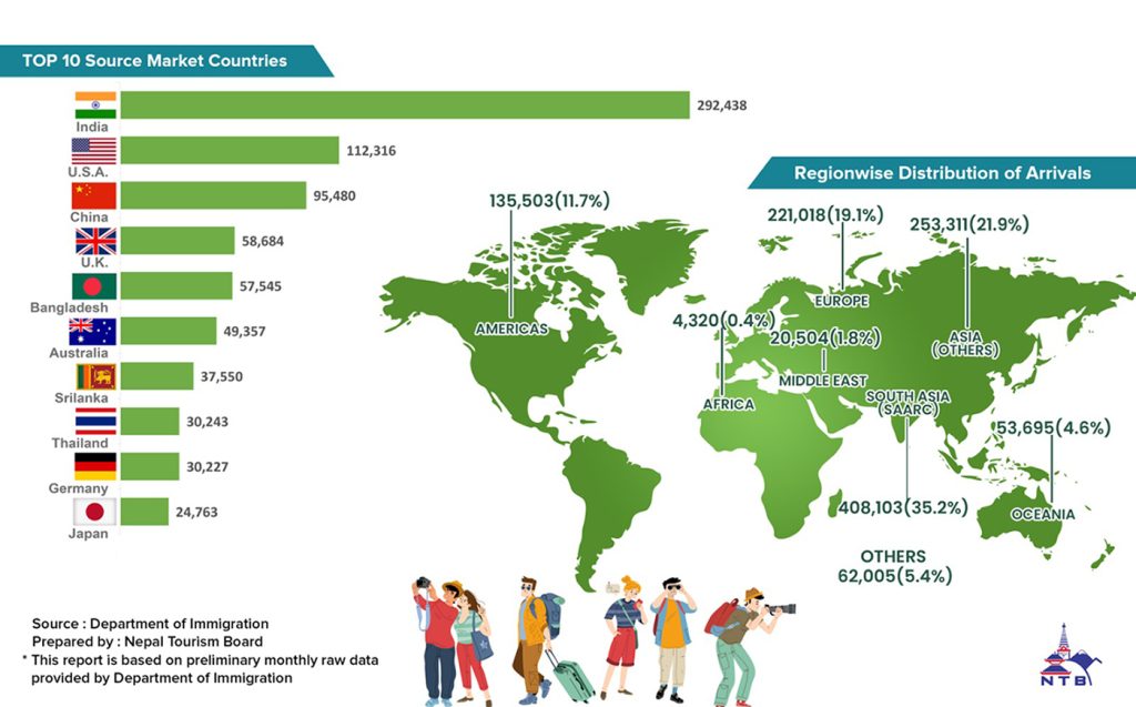 सन् २०२५ मा हवाई मार्गबाट साढे ११ लाख बढी पर्यटक नेपाल आए