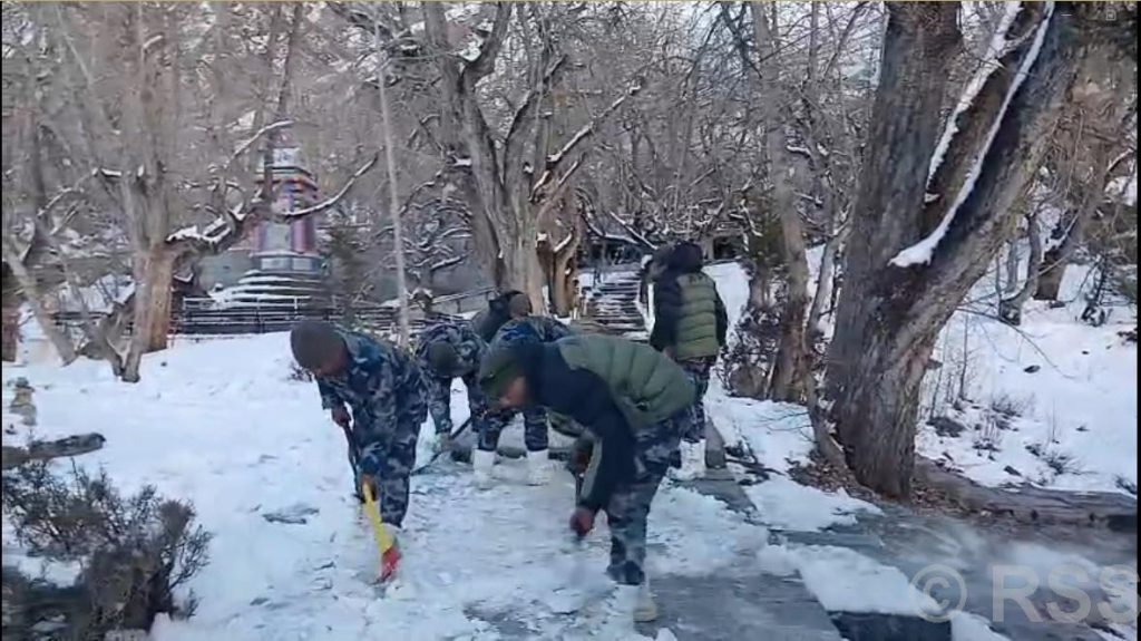 सशस्त्र प्रहरीले मुक्तिनाथ मन्दिरको हिउँ पन्छायो