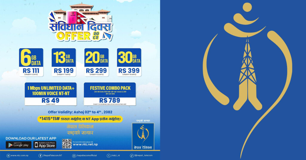 संविधान दिवसका अवसरमा नेपाल टेलिकमले विशेष ‘अफर’ सार्वजनिक गरेको छ । टेलिकमले संविधान घोषणाको एक दशक पूरा भएको अवसरमा ‘संविधान दिवस अफर २०८२’ सार्वजनिक गरेको हो । यो अफर शनिबार (४ भदौ)सम्म लागू हुनेछ । अफरअन्तर्गत ४९ रुपैयाँमा एक दिनका लागि एक एमबिपिएस अनलिमिटेड डाटा र नेपाल टेलिकमका नेटवर्कभित्र १०० मिनेट भ्वाइस कल सेवा उपलब्ध हुनेछ । यसैगरी, एक […]