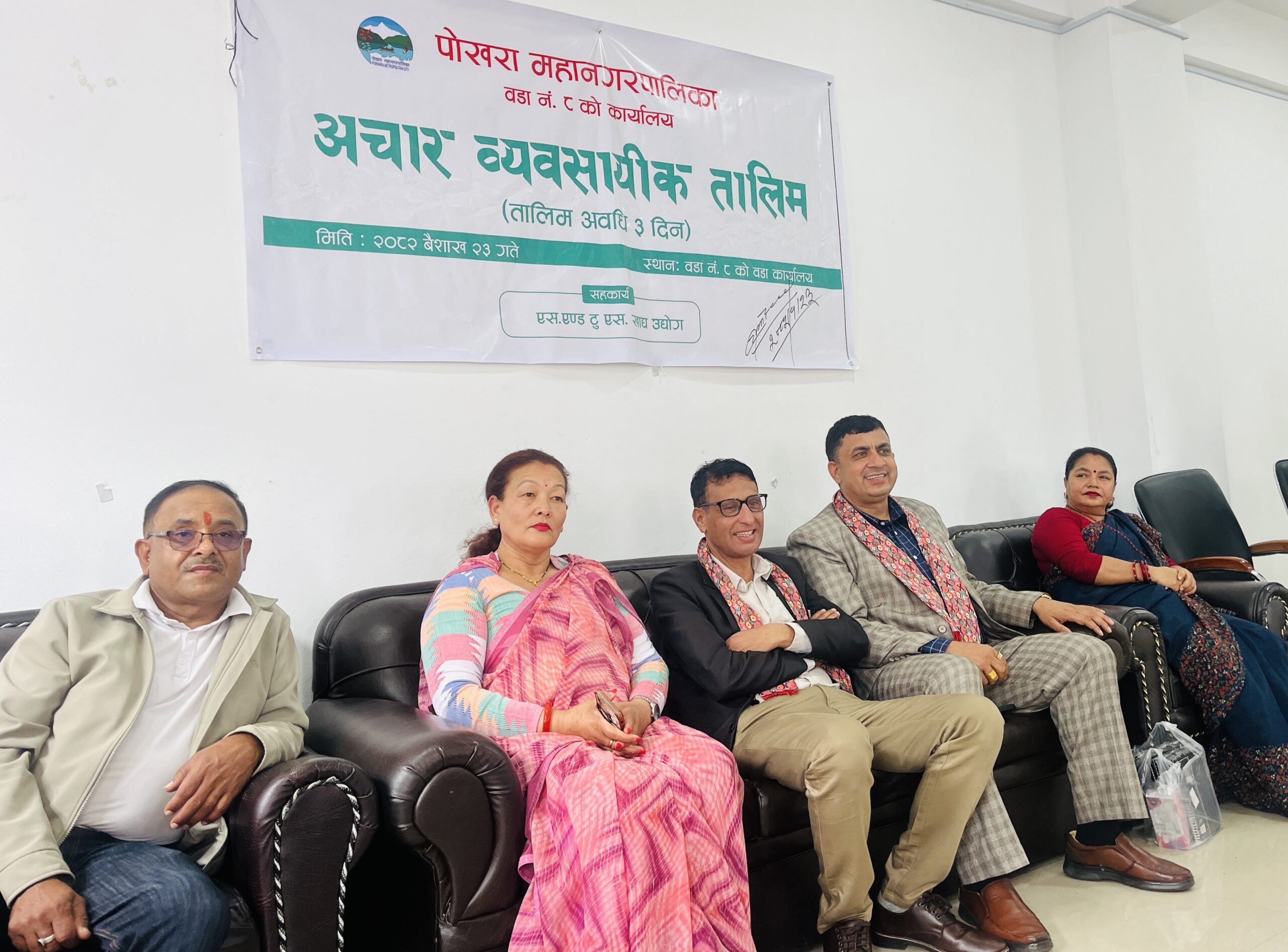 वडा नं ८ मा आयोजना गरिएको तीनदिने अचार बनाउने तालिम सम्पन्न भएको छ। स्थानीय स्तरमा सीप विकास तथा आत्मनिर्भरता अभिवृद्धिको लक्ष्यसहित सञ्चालन गरिएको तालिमको संयोजन वडा अध्यक्ष रूद्रनाथ बरालले गर्नुभएको हो। कार्यक्रमका प्रमुख अतिथि वडा नं ७ कै अध्यक्ष राम मोहन आचार्य रहनुभएको थियो भने अतिथिका रूपमा वडा सदस्यहरू पार्वति के.सी, लक्ष्मी बी.के, गोविन्द बराल, हिराकाजी श्रेष्ठ र वडा सचिव झम्कनाथ पौडेलको उपस्थिति रहेको थियो।