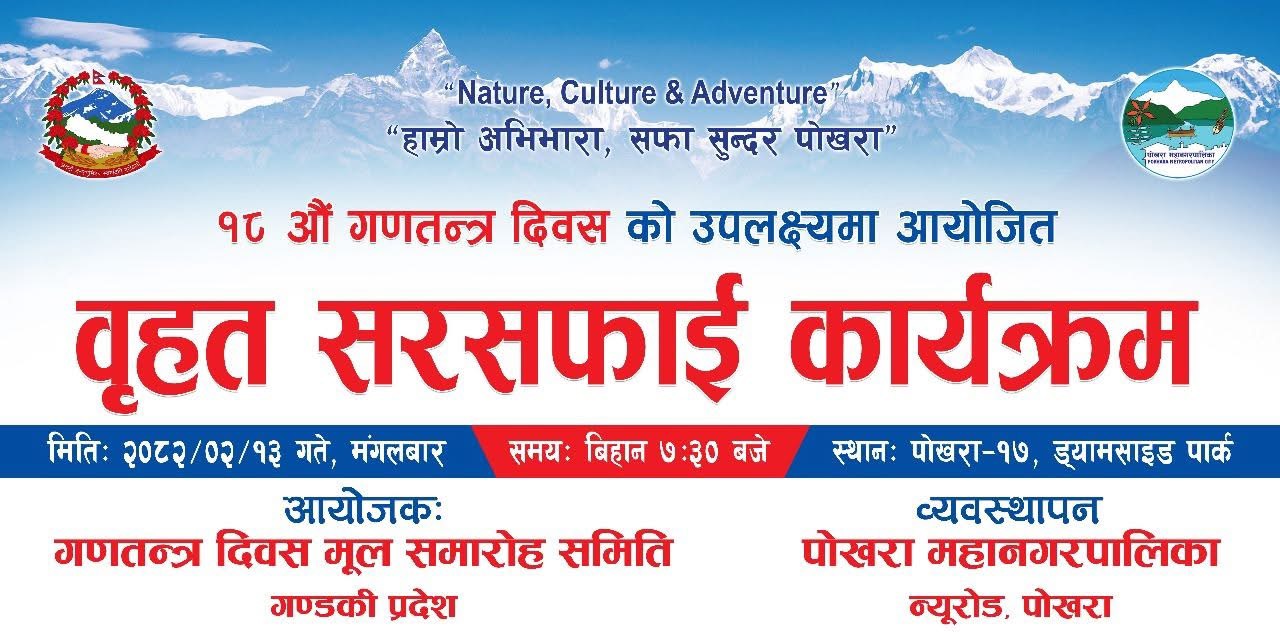 पोखरा, – १८औँ गणतन्त्र दिवसको अवसरमा पोखरामा भोलि (जेठ १३ गते, मंगलवार) बिहान ७:३० बजे वृहत सरसफाइ कार्यक्रम आयोजना हुने भएको छ। पोखरा–१७ स्थित ड्रायामसाइड पार्क क्षेत्र सञ्चालन हुने उक्त कार्यक्रममा गण्डकी प्रदेशको गणतन्त्र दिवस मूल समारोह समिति आयोजक र पोखरा महानगरपालिका व्यवस्थापकका रूपमा रहनेछ।