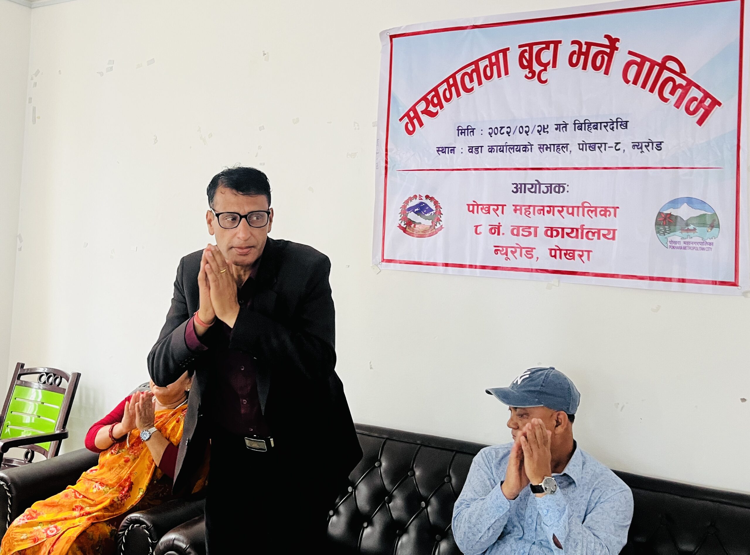 पोखरा महानगरपालिका वडा नं. ८ मा महिलाहरूको सीप अभिवृद्धि तथा स्वरोजगार प्रवर्द्धनका लागि १० दिने “मखमलीमा बुट्टा भर्ने तालिम” सुरु गरिएको छ। वडास्तरीय कार्यक्रमअन्तर्गत सञ्चालन गरिएको तालिम वडा कार्यालयको सभाहलमा प्रारम्भ भएको हो।