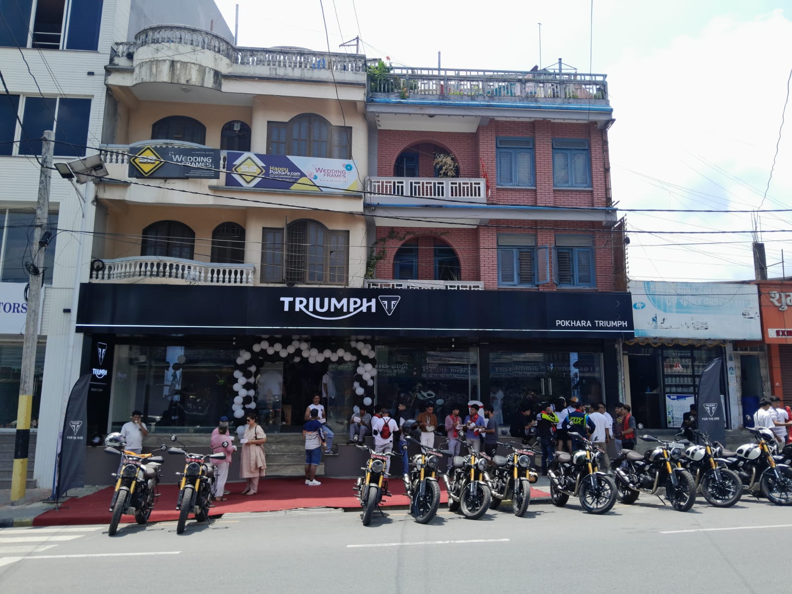 ट्रायम्फ ब्राण्डको मोटरसाइकल शोरुमको पोखारा शोरुमको उद्घाटन गरिएको छ ।ट्रायम्फले शनिवार पोखराको नयाँबजारमा शोरुमको औपचारिक उद्घाटन गरेको हो । शोरुममो आधिकारीक डिलरको रुपमा इच्छाशक्ति अटोमोवाइल्स रहेको छ । २ मोडलमा उपलब्ध मोटरसाइकलको हाल बजार मुल्य ट्रायम्फ स्पीड ४०० को ६ लाख ४९ हजार ९ सय र स्क्रयाम्बलर ४०० एक्सको मुल्य ६ लाख ९९ हजार ९ सय रहेको छ।
