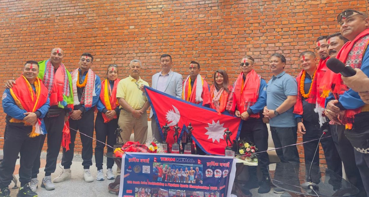 त्यसअघि आइतबारै टोलीलाई कार्यकारी समितिका सदस्य भट्टराई, नेपाल शारीरिक सुगठन तथा फिट्नेस महासंघका प्रथम उपाध्यक्ष विजयलाल कायश्थसहित पदाधिकारी, खेलाडी, प्रशिक्षक, शुभचिन्तक, परिवारजनलगायतले अन्तर्राष्ट्रिय विमानस्थलमा स्वागत गरेका थिए ।