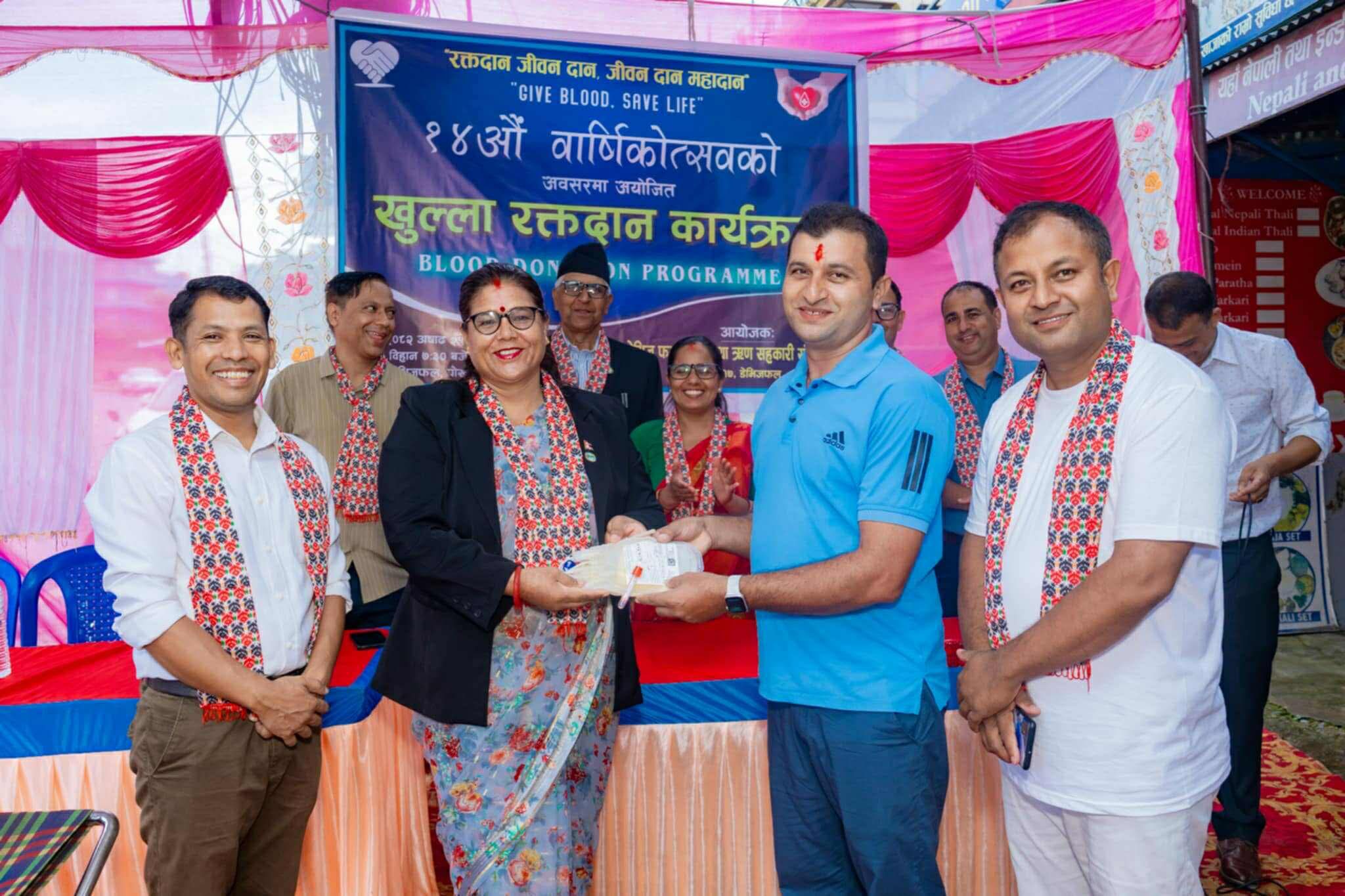 उक्त कार्यक्रममा सस्थाका उपाध्यक्ष एवं कार्यक्रमका संयोजक राजेन्द्र थापाले स्वागत मन्तब्य एवं रक्तदानका बारेमा जानकारी गराए । सभाध्यक्ष एवं संस्थाकाअध्यक्ष राजनअधिकारीले संस्थाले आयोजना गरेको कार्यक्रममा उपस्थिती एवं आमन्त्रित अतिथिहरुको उपस्थिती संस्थाको पेरणाको स्रोत रहने जानकारी गराउदै संस्थाको चौधौ बार्षिक उत्सवलकार्यक्रमको अवसरमा प्रत्क्षय एवं अप्रत्यक्ष रुपमा सहयोग पू—याउने सम्पूर्ण महानुभाव, शुभकामना प्रदान गर्नु हुने सम्पूर्ण सघ संस्था एवं ब्यक्तित्व , लगायत छाता संगठनहरुमा बिषेष कृतज्ञता व्यक्तगर्दै आगामी दिनमा समेत यस्तै सहयोग एवं सद्भाव रहने आशा व्यक्त गर्नुभयो । कार्यक्रममा रत्तदाताहरुलाई प्रमाण पत्र एव संस्थाको लागो अकित टिसर्ट एव प्रमुखअतिथि, बिशेष अतिथि र अतिथिहरुलाई मायाको चिनो स्वरुप संस्थाको लागो अकित टिसर्ट बितरण गरिएको थियो। कार्यक्रमको सञ्चालन संस्थाका सचिव प्रकाश सुबेदीेले गरेका थिए ।