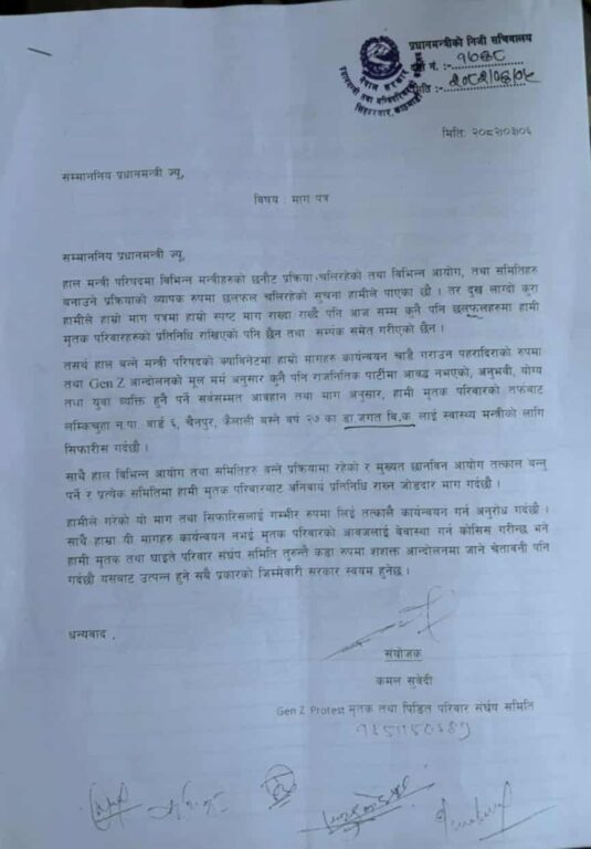 गत भदौ २३ र २४ गते जेनजी युवाहरुले गरेको आन्दोलनमा ज्यान गुमाएका परिवारहरूले प्रधानमन्त्री सुशीला कार्की र गृहमन्त्री ओम प्रकाश अर्याललाई मागपत्र बुझाएका छन् ।