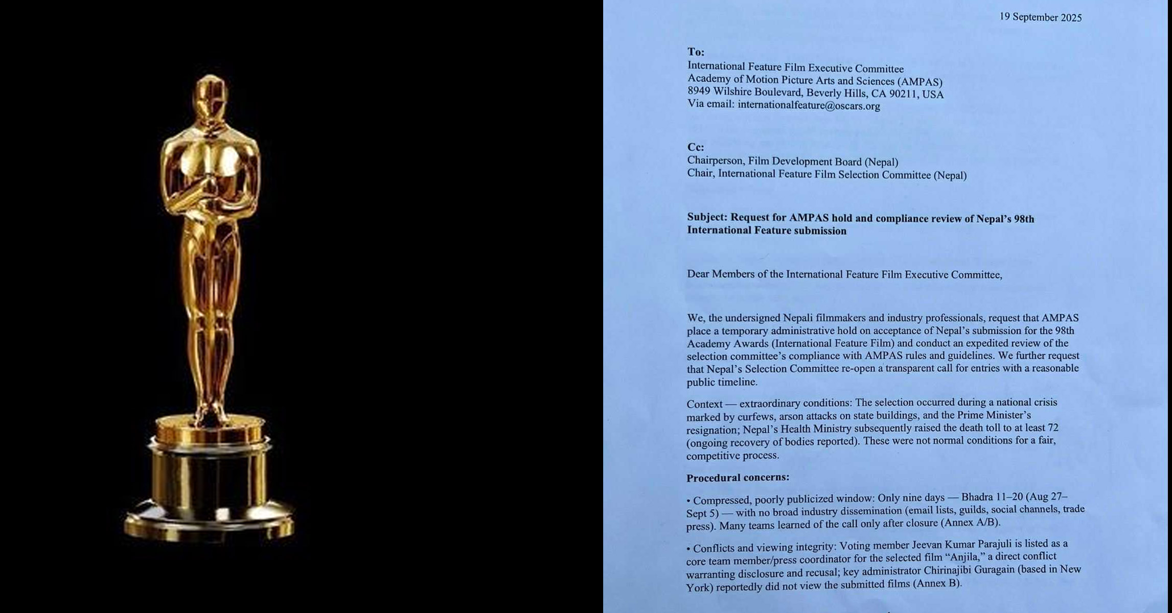आगामी वर्ष अमेरिकामा हुने अस्कर अवार्डका लागि नेपालस्थित छनोट समितिको निर्णयविरुद्ध चलचित्रकर्मीहरुले अमेरिकास्थित मुख्यालयमा उजुरी दिएका छन्। आइतबार छनोट समितिको निर्णयमा आपत्ति जनाउँदै नेपाली चलचित्रर्मीहरुले अस्कर अवार्डको मुख्यालयमा उजुरी दिएका हुन्।