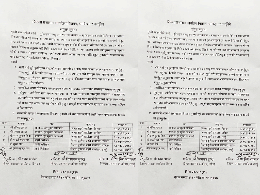 विभागका अनुसार भारी वर्षा हुन सक्ने पूर्वानुमान रहेको र उक्त पूर्वानुमानबमोजिम वर्षा भएमा सडक आवागमन थप जोखिमयुक्त हुन सक्ने सम्भावनालाई दृष्टिगत गर्दै संयुक्त रूपमा सूचना जारी गरी सार्वजनिक अपिल गरिएको छ।
