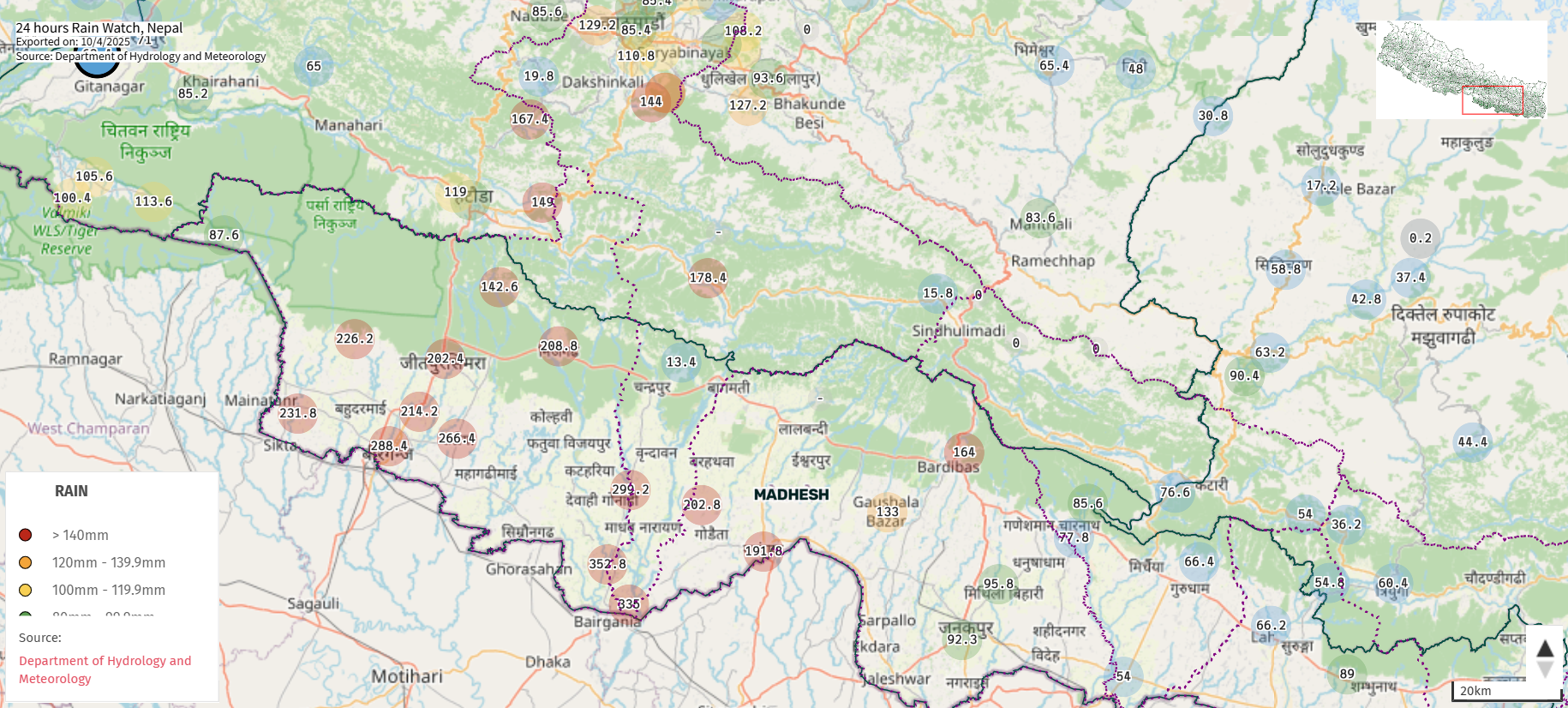 रौतहटको मशेपुर क्षेत्रमा पछिल्लो २४ घन्टामा ३५२.८ मिलिमिटर वर्षा भएको छ। रौतहटकै गौरमा ३३५, सर्लाही मनुस्मारा २०२.८, मलंगवामा १९१.८, रौतहटको गरूडामा २९९.२ बाराको निजगढमा २०८.८, कलैया २६६.४, पर्साको वीरगञ्ज २८८.४ मा, पर्साको मुडलीमा २३१.८, पर्साकै रंगपुरमा २६२.२ र सिमरा विमानस्थल २०२.४ मिलिमिटर वर्षा भएको छ।