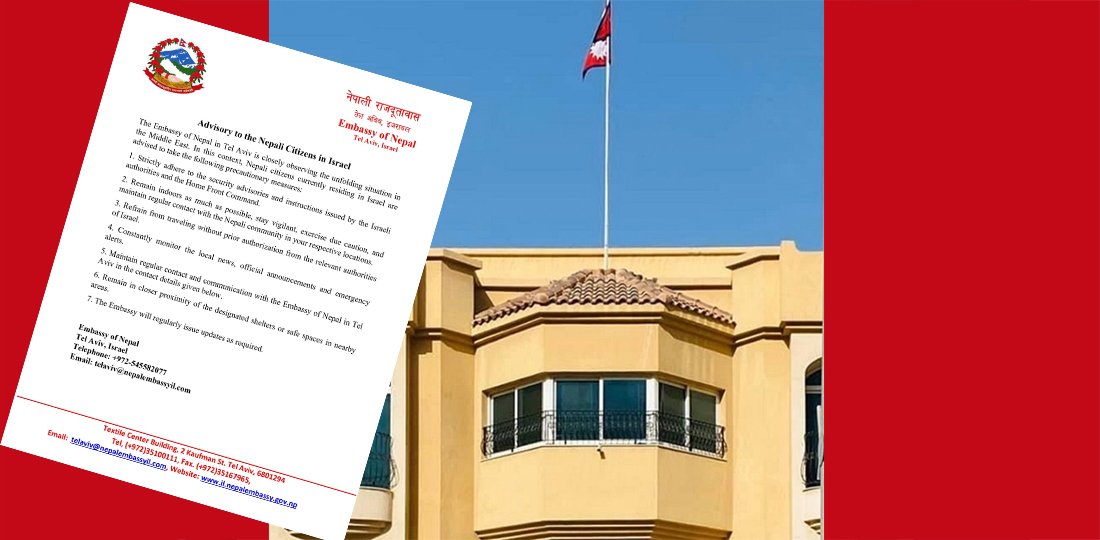 मध्यपूर्वमा विकसित पछिल्लो घटनाक्रम र बढ्दो सुरक्षा संवेदनशीलतालाई मध्यनजर गर्दै इजरायलको तेल अविवस्थित नेपाली राजदूतावासले त्यहाँ रहेका सम्पूर्ण नेपाली नागरिकलाई उच्च सतर्कता अपनाउन आग्रह